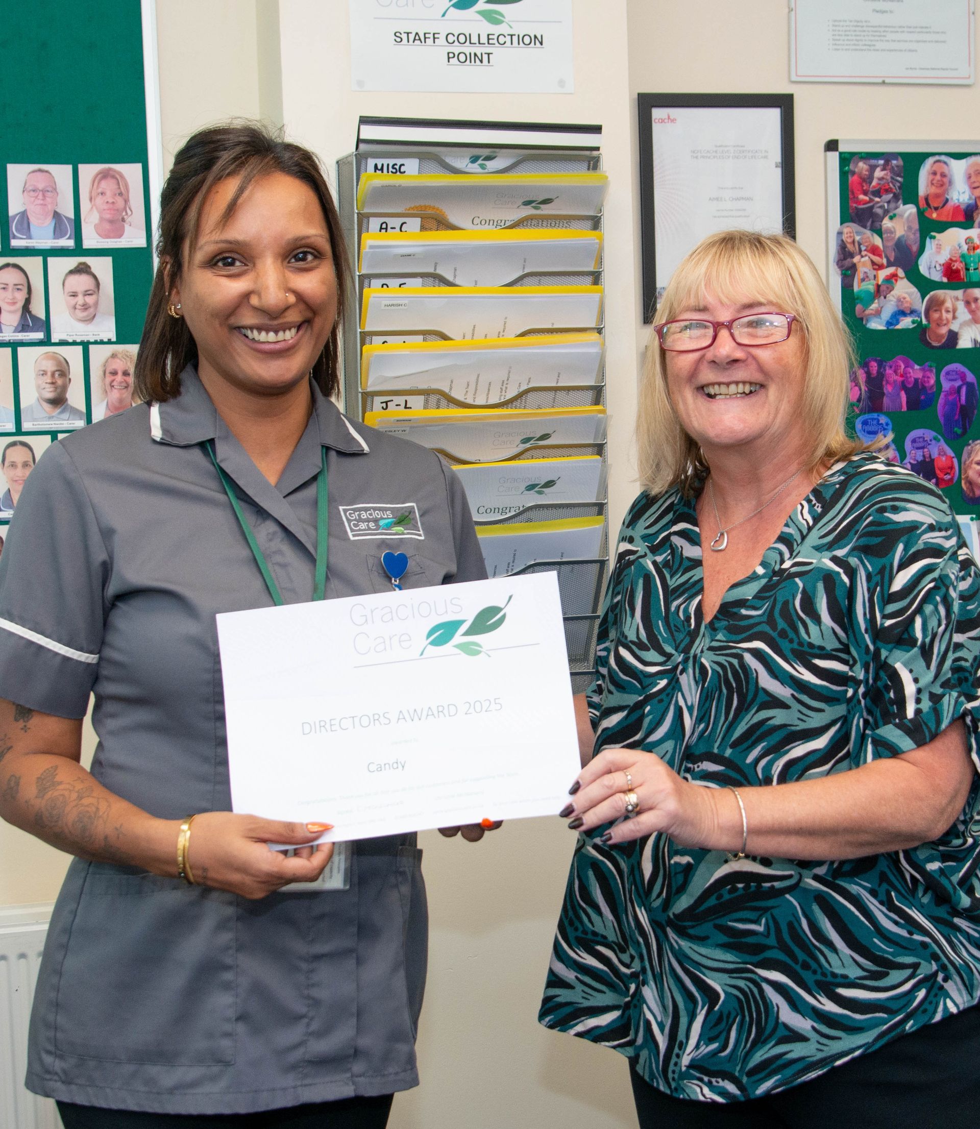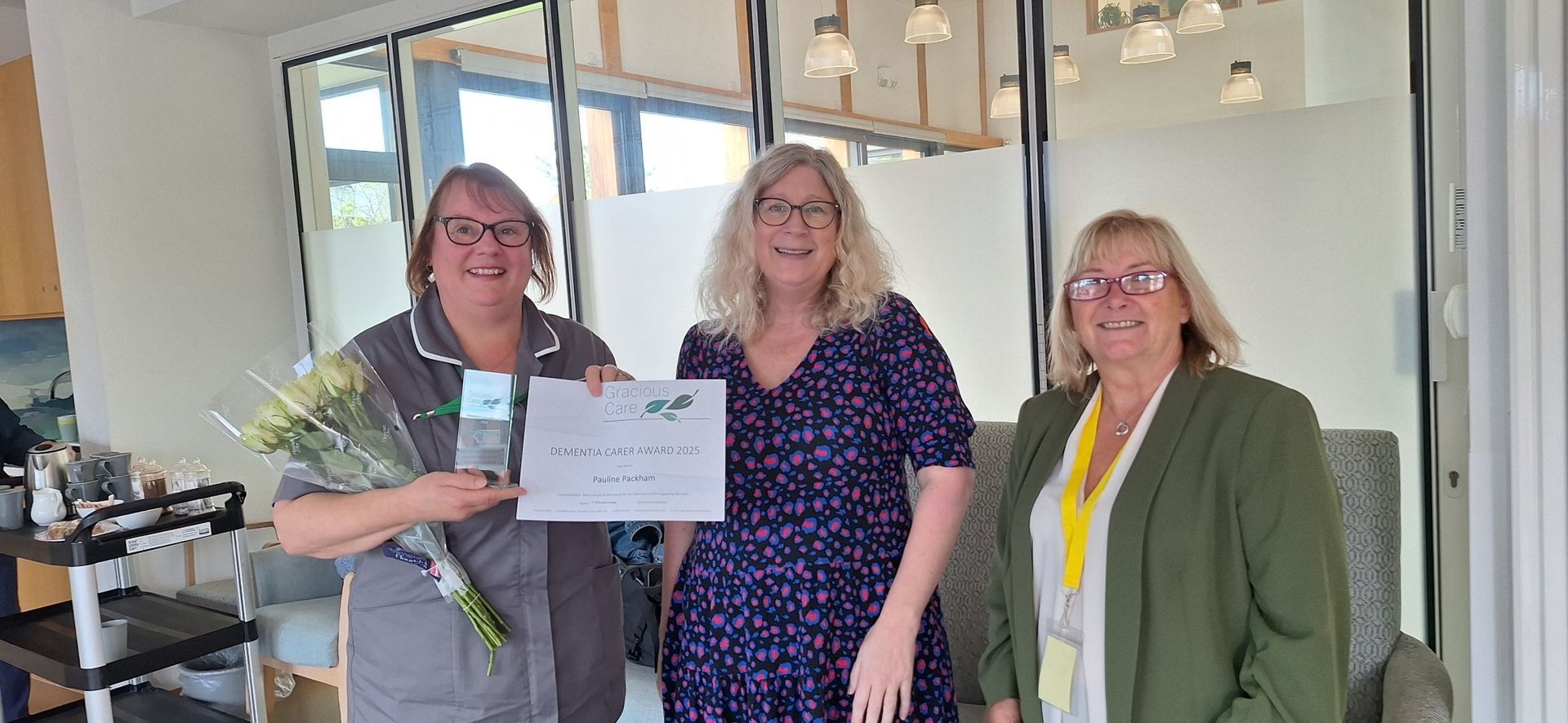 Whilst Gareth Davis was with us, he kindly presented some of our staff with their latest awards. Catherine was among 8 staff who've recently attained recognition from the NVQ awarding body of their hard work, supported and encouraged by Gracious Care